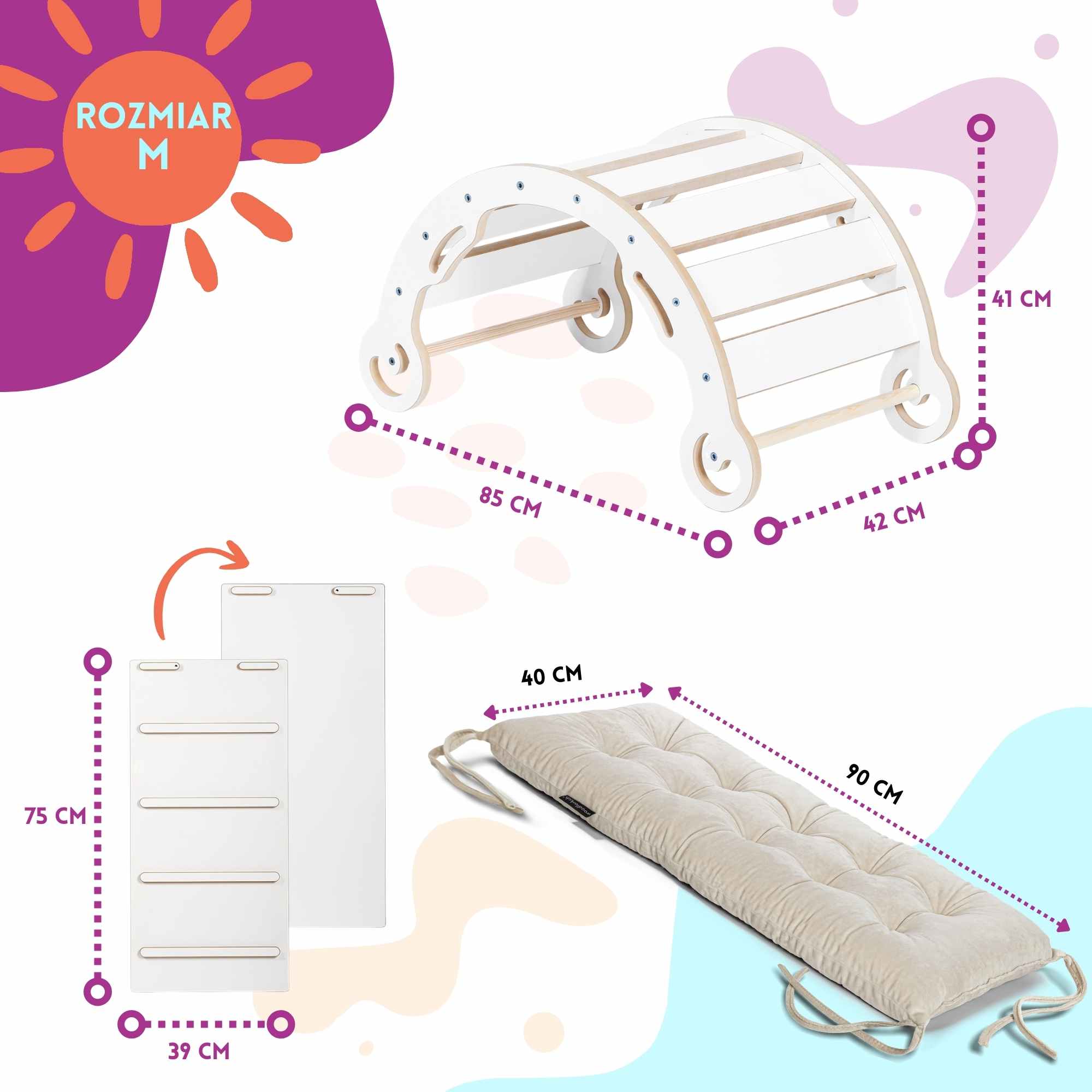 • Zestaw 3w1: Bujak Montessori + zjeżdżalnia-drabinka w rozmiarze M + poduszka velvet.