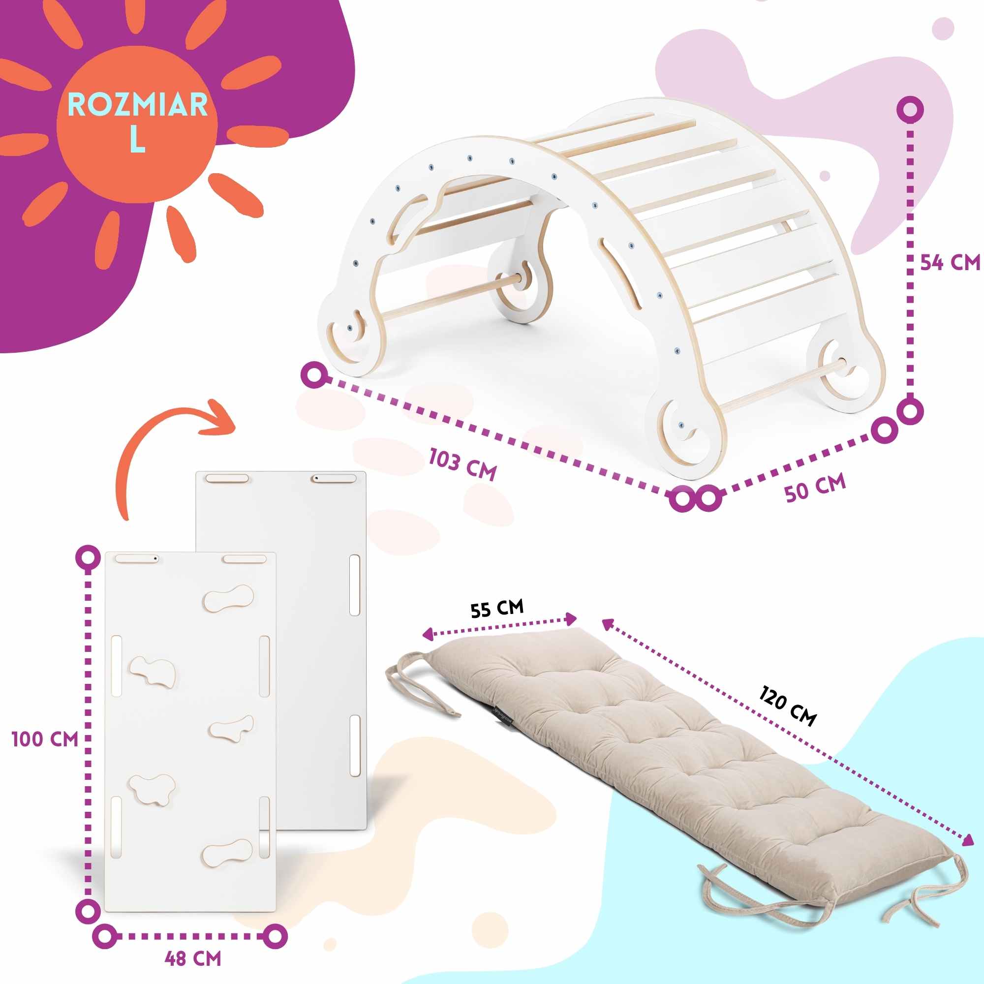 • Zestaw 3w1: Bujak Montessori + zjeżdżalnia-ścianka w rozmiarze L + poduszka velvet.