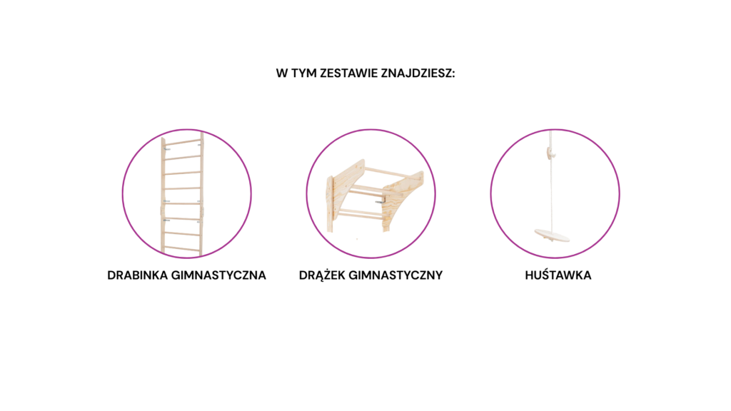 • W zestawie: drabinka gimnastyczna, drążek gimnastyczny (zawiesie regulowane), huśtawka okrągła.