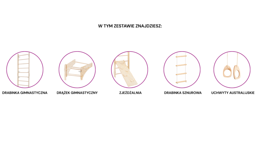• W zestawie: drabinka gimnastyczna, drążek gimnastyczny (zawiesie regulowane), zjeżdżalnia, drabinka sznurowa, uchwyty gimnastyczne.