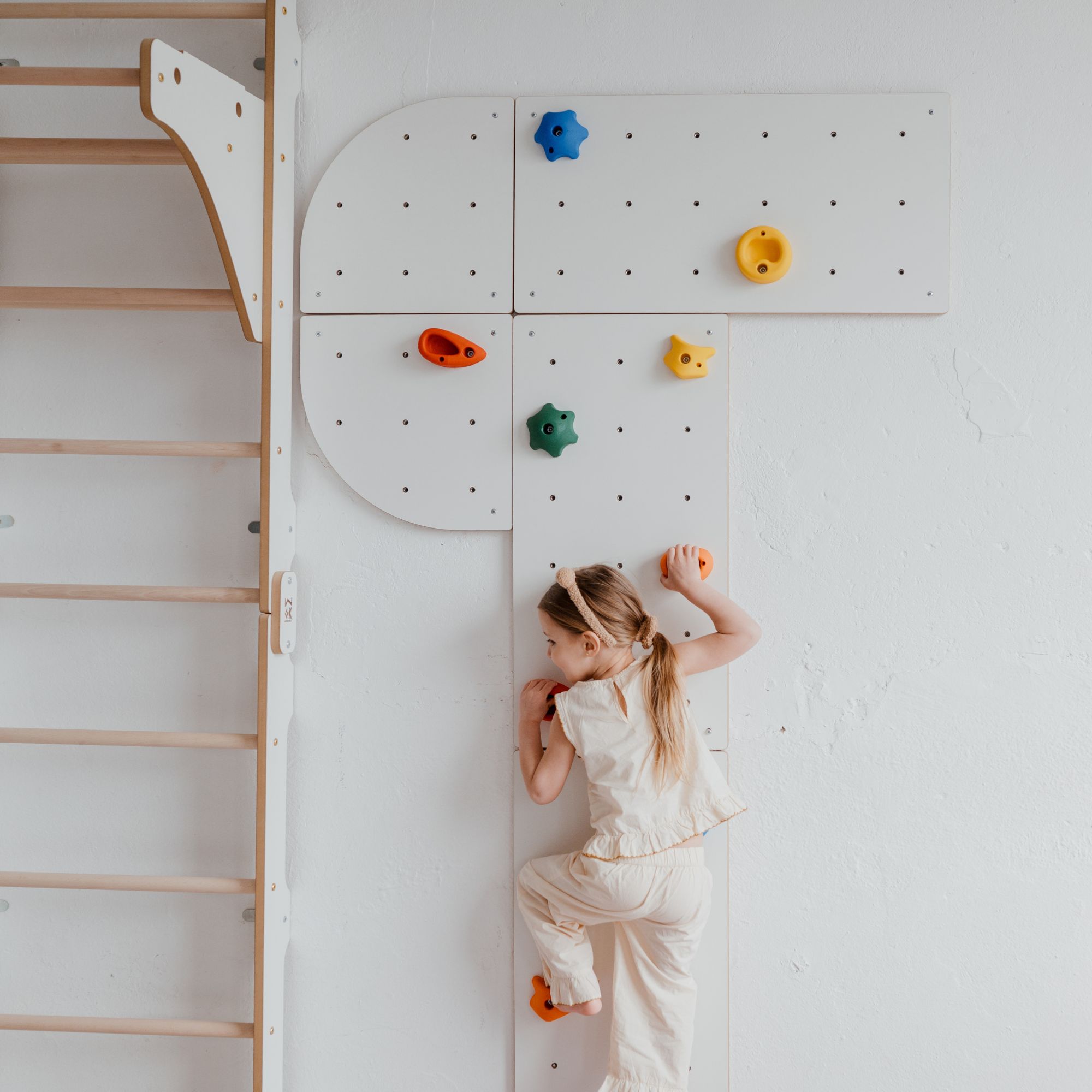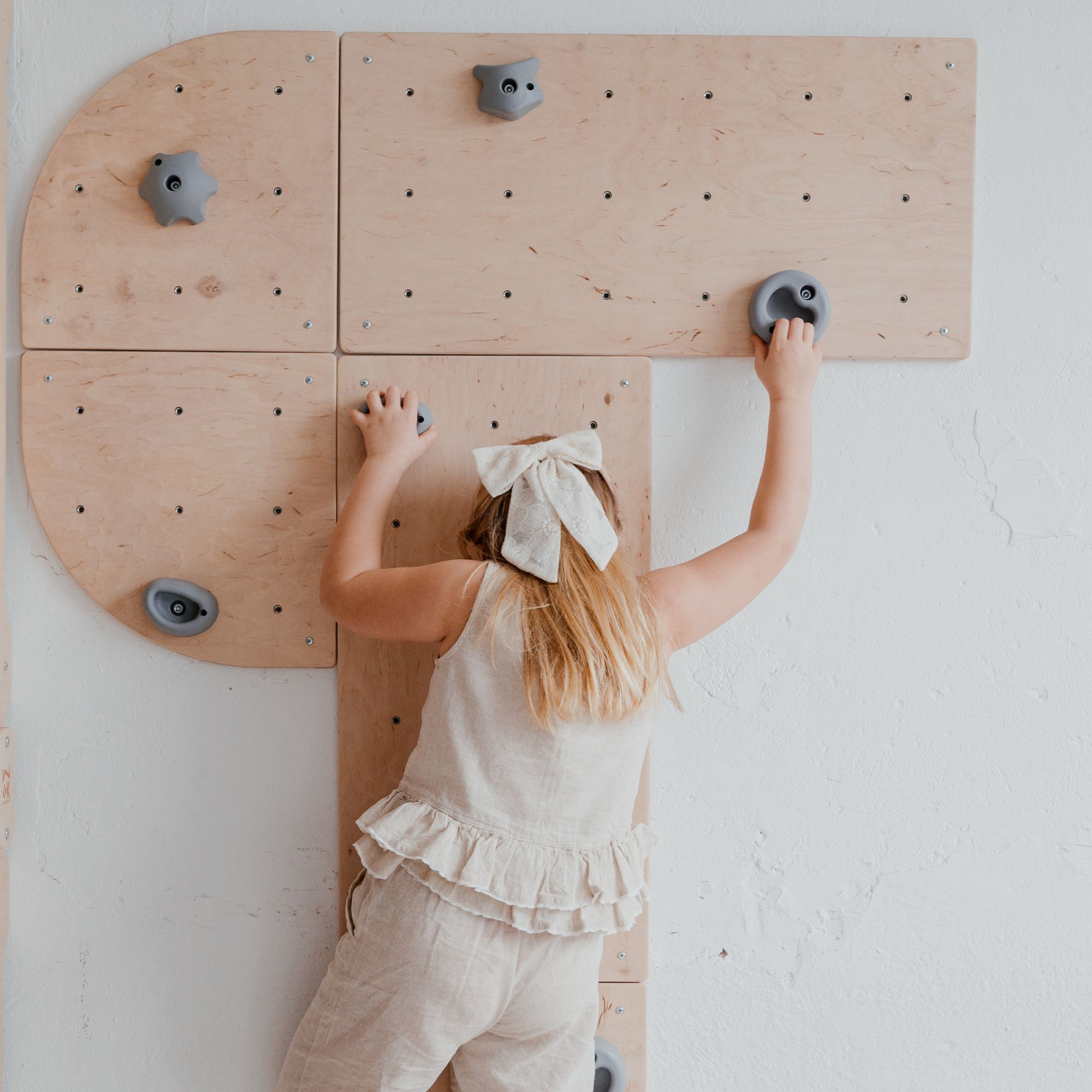 Panel wspinaczkowy dla dzieci 40×80 cm to idealna baza do stworzenia własnej ścianki wspinaczkowej w stylu Montessori. Minimalistyczny, solidny i gotowy do rozbudowy – pozwala dopasować przestrzeń zabawy dokładnie do potrzeb dziecka.